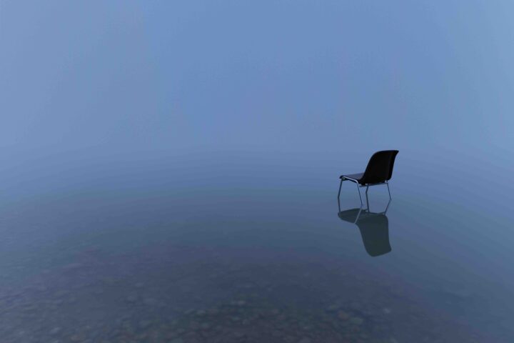 A single chair reflecting on a water surface on a stormy day